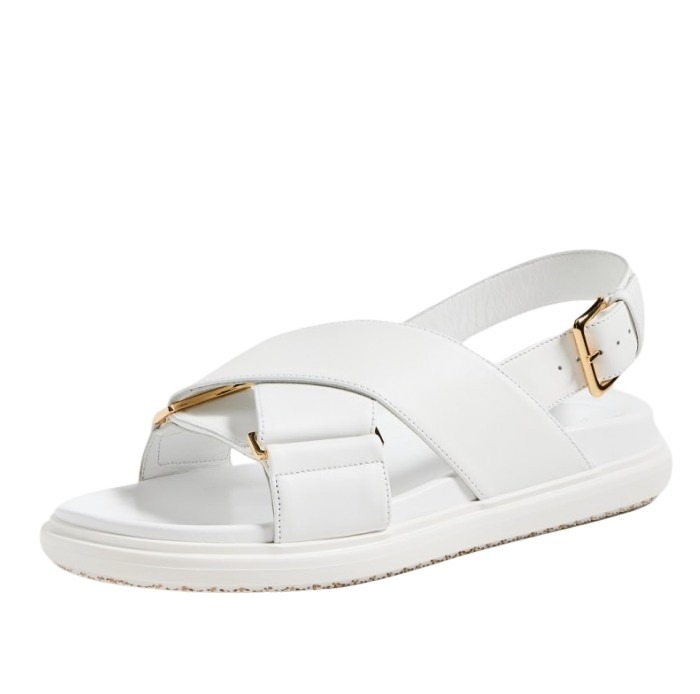 Unique crisscross detailing creates a fashion-forward statement with these crisp white sandals that will complement any skirt or dress.