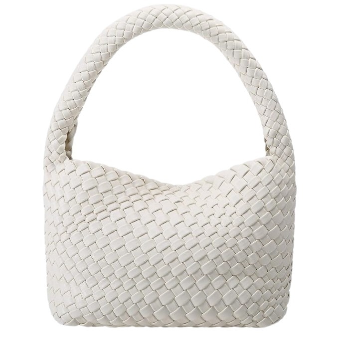 Clean white leather and an on-trend woven design add sophistication to this top handle bag, making it a versatile accessory to pair with denim, dresses, skirts, and tops.