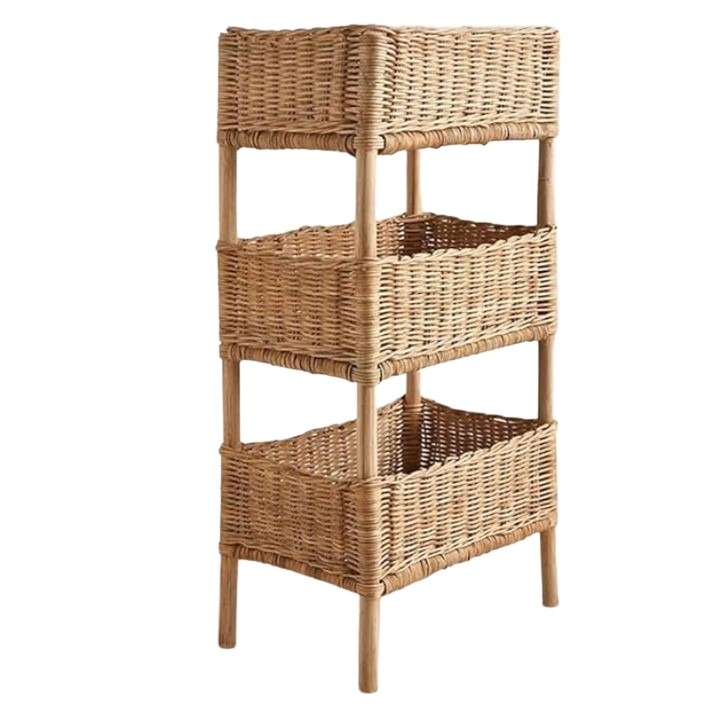 This hand-woven rattan shelving unit offers a stylish solution to reduce visual clutter in your home office. With three tiers, it provides ample space for organizing books, documents, or decorative items, enhancing both function and aesthetics.