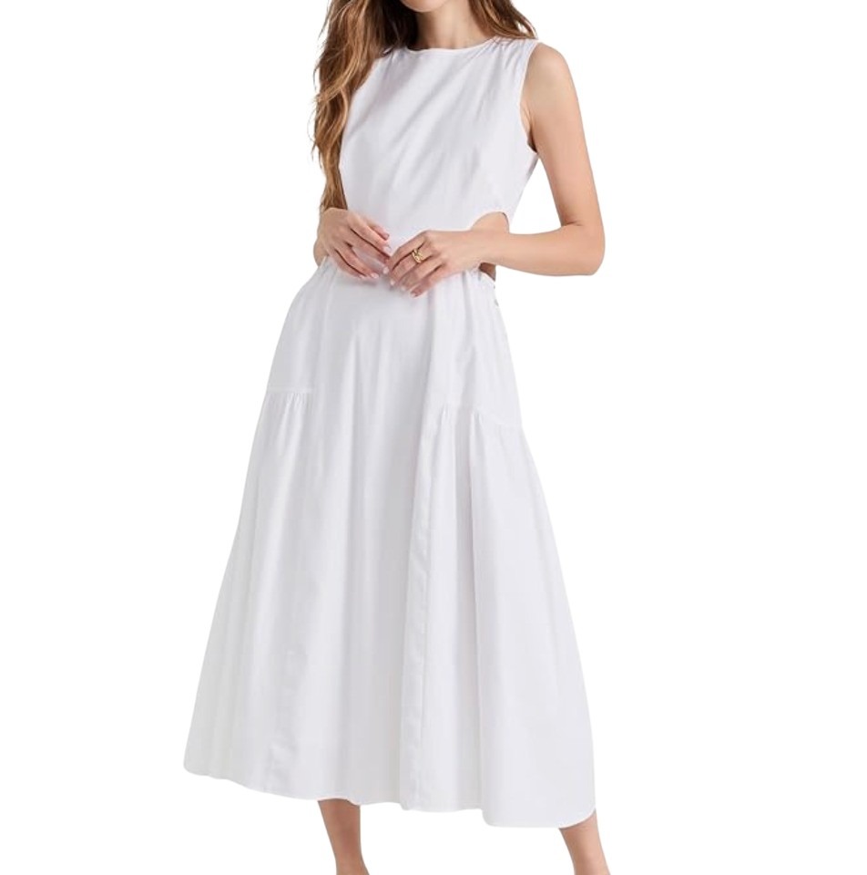 With a flattering silhouette and side cut-outs with adjustable ties, this sleeveless midi dress is the perfect versatile styling piece to add to your closet this spring.