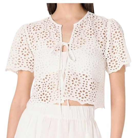 This romantic lace top features delicate scalloped edges and a tie-front design, offering a feminine touch to any outfit. Pair it with the matching skirt for an effortlessly coordinated ensemble.