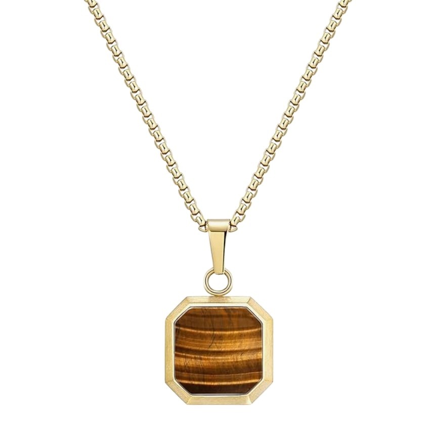This elegant necklace features a square tiger’s eye pendant set in 14K gold plating, suspended from a sleek box chain. Its minimalist design adds a touch of sophistication to both casual and formal looks.