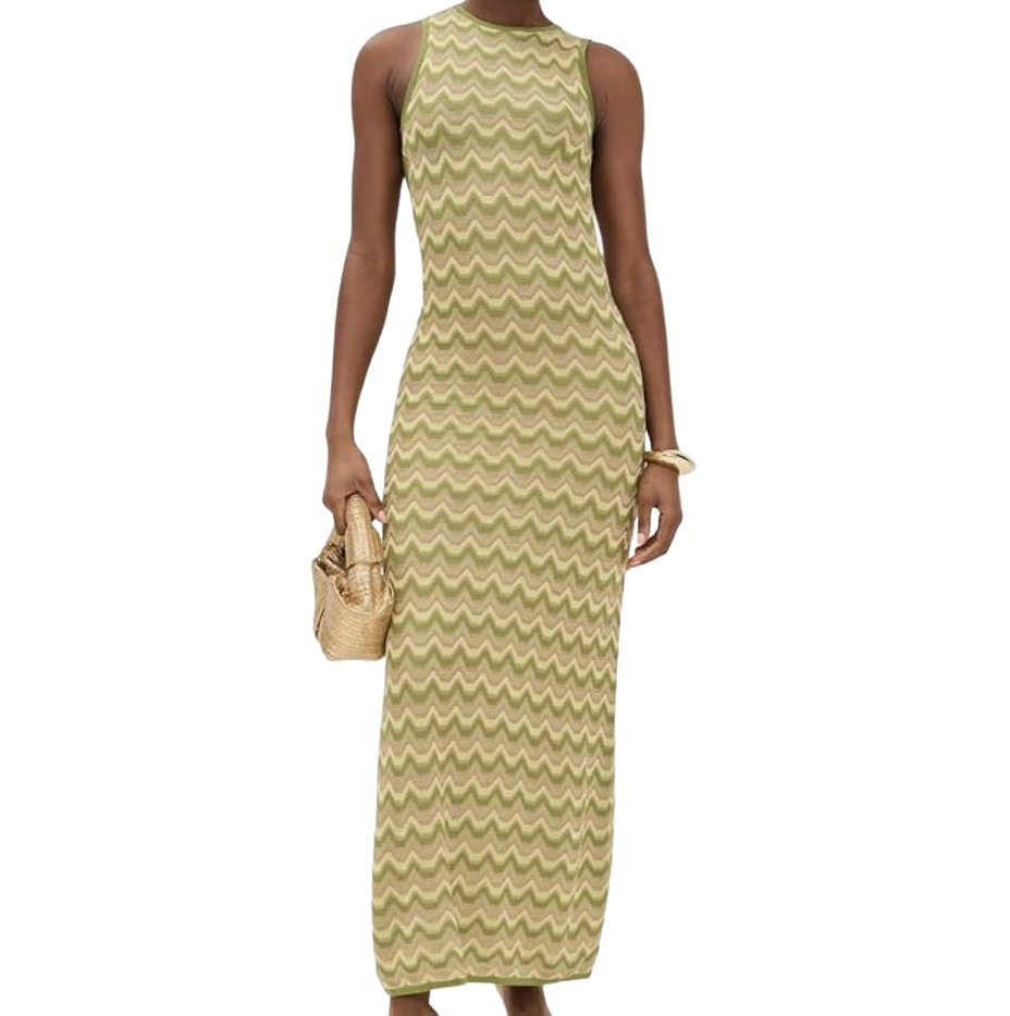 This fine-knit maxi dress showcases a wavy pattern interwoven with subtle metallic threading, creating a shimmering effect. Its sleeveless design and lightweight fabric make it a chic choice for warm-weather occasions.