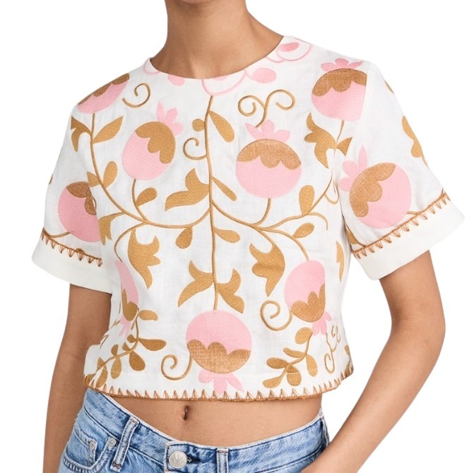Featuring intricate floral embroidery and a cropped silhouette, this linen top is a blend of elegance and effortless style, whether wearing with the matching shorts, or wide leg denim.