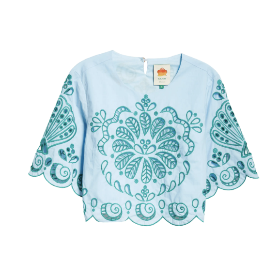Delicate eyelet detailing and a breezy cropped silhouette make this floral embroidered top a versatile piece perfect for pairing with high-waisted shorts or skirts for a carefree, bohemian look.