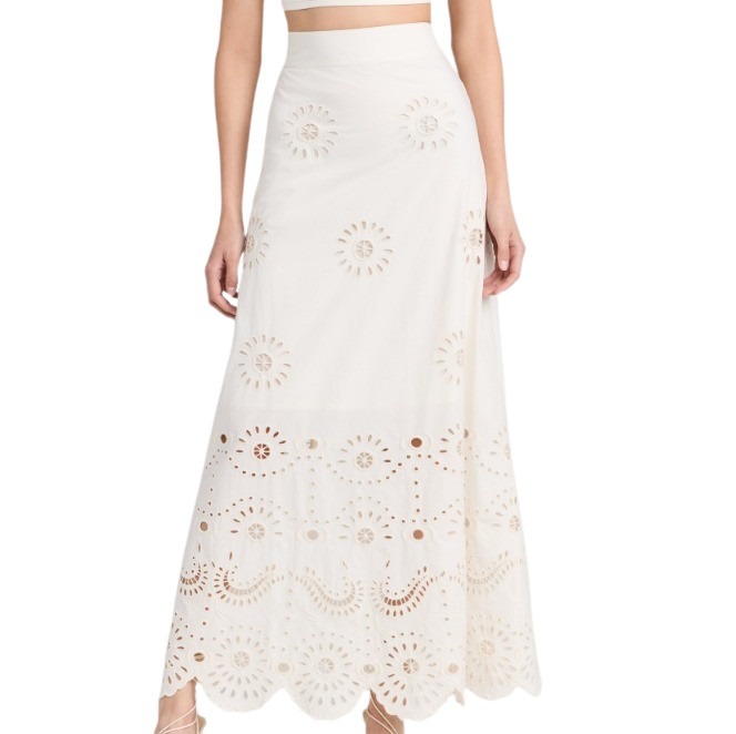 Featuring a scalloped hem and delicate eyelet embroidery, pair this maxi skirt with a blouse and strappy sandals for a breezy yet polished spring or summer ensemble.