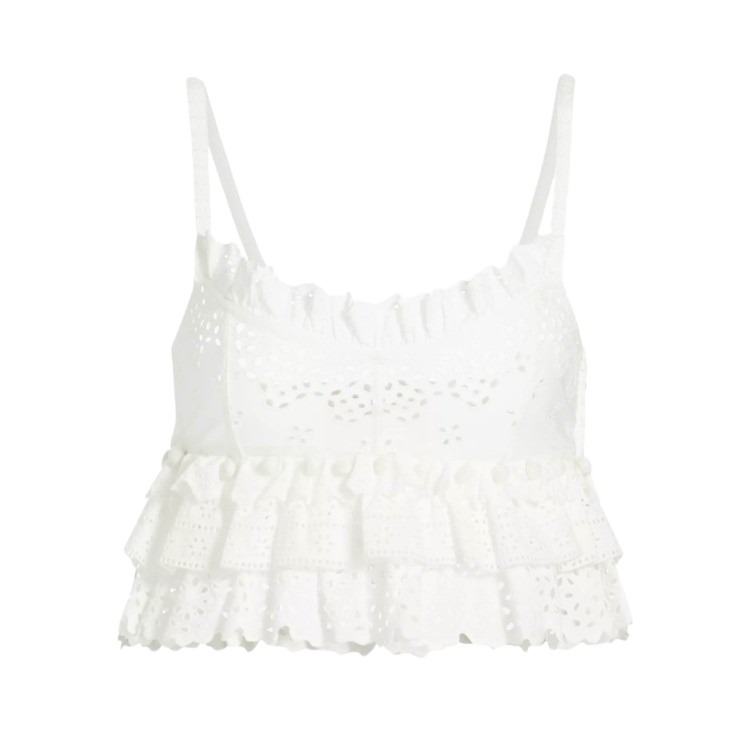 Pair this versatile ruffled eyelet tank top with a flowing maxi or mini skirt and woven slides for a romantic, bohemian ensemble.