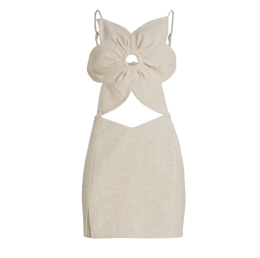 With a sculpted floral bodice and chic cut-out details, this canvas mini dress is a perfect embodiment of spring, exuding both femininity and playful elegance.