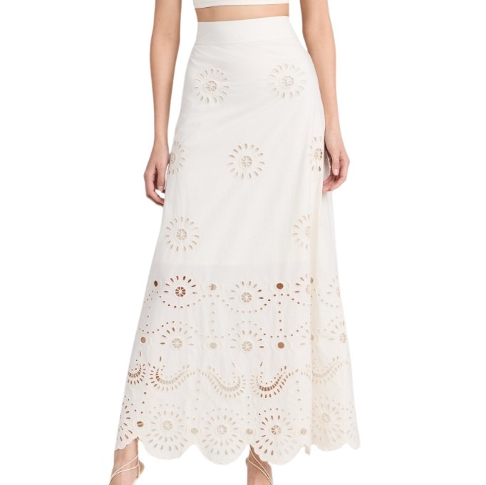 This scalloped midi skirt features intricate eyelet embroidery that infuses any outfit with feminine and bohemian charm.