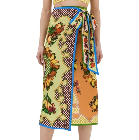 Embrace effortless elegance with this flowy silk wrap skirt adorned with a playful lemon print, perfect for adding a touch of whimsy to your spring wardrobe.