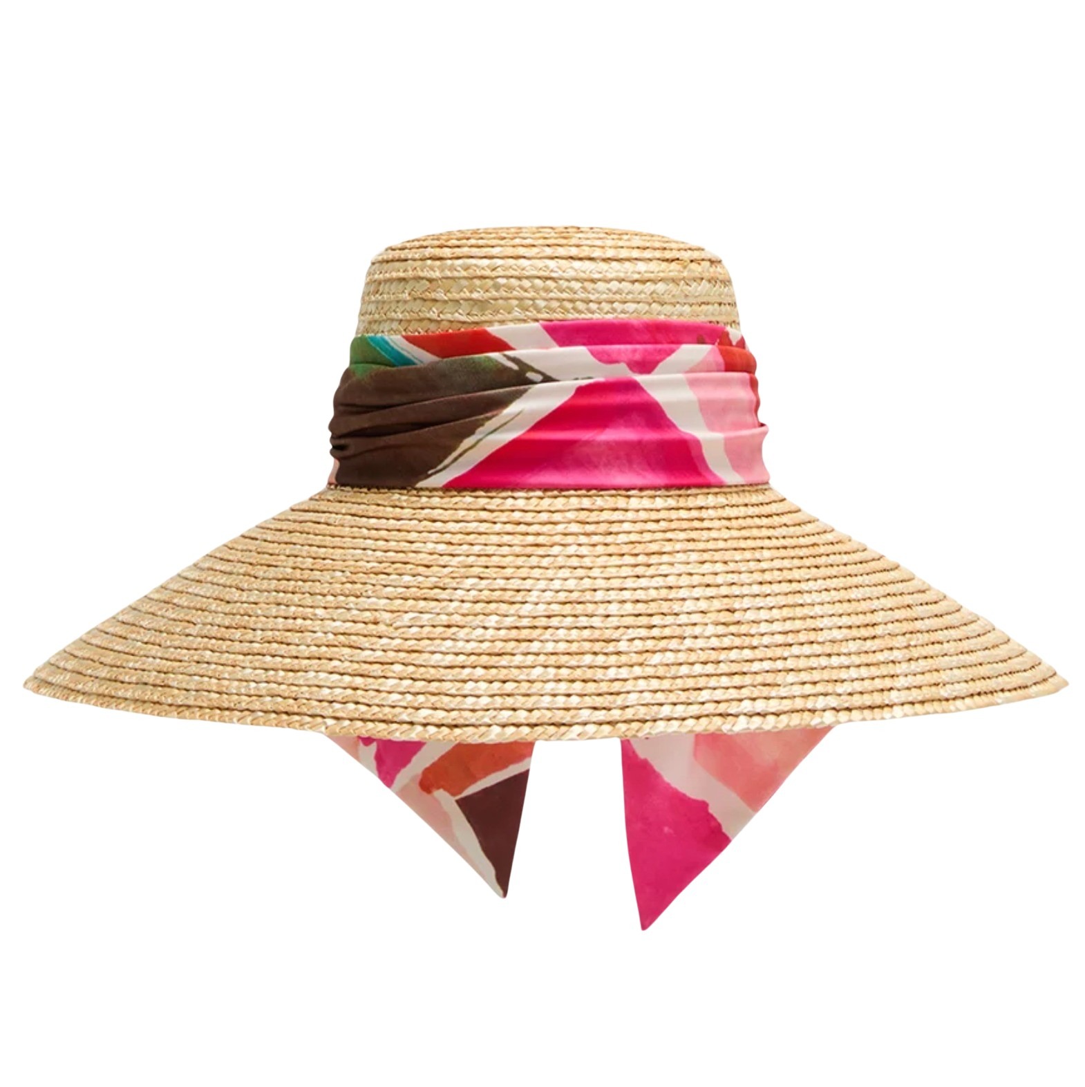 Complete your warm weather look with this statement large brim hat adorned with a luxurious silk scarf, adding a touch of glamour and refinement to any outfit.