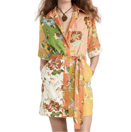 Embrace carefree vacation vibes with this floral mini shirt dress. The relaxed fit and spliced detailing make it a statement piece for breezy days and casual evenings during your getaway.