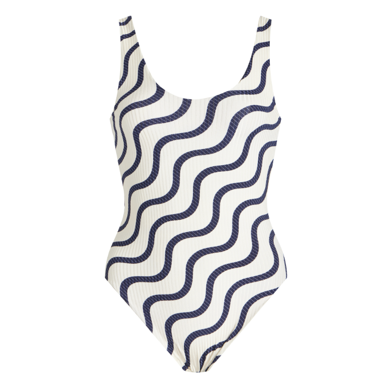 A classic one piece silhouette gets a modern update with an eye-catching wavy print on this chic swimsuit, perfect with shades and sandals by the beach or pool.